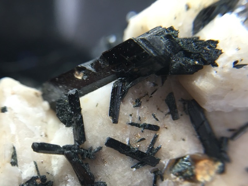 南東アフリカにあるマラウイ共和国の ゾンバ地区マロサ鉱山の正長石。 ![]() 正長石テーブルの上には 様々な鉱物結晶がまぶしてあります。。 ![]() 特に目立つのは漆黒の柱状結晶でしょう。 ![]() これは「エジリン輝石」と言います。 発明王「エジソン」とは違います。 「ソ」じゃなくて「リ」です。 ![]() 仕事柄、小学生の書くカタカナをよく読まされますが 「シ」と「ツ」の違い、「ソ」と「ン」と「リ」の違いは 永遠のロマンスです。 ![]() 小学生の手にかかれば もしかしたらこの石は「エヅソン輝石」になってしまう かもしれません。 ちゃんと書けたら、それこそ「きせき」です。 閑話休題。 水晶片が少し見られますが・・・ ![]() 水晶にエジリン輝石がインクルーズされていますね。 エジリン輝石は鉄とナトリウムを含む単斜輝石で 鉄の代わりにアルミニウムが入ると 「ひすい輝石」になります。 あー、そうか。 長石の方にアルミ全部持っていかれたのか。 なるほど。 さて、短波紫外線を照射してみます。 ![]() 正長石が赤く灯りました。 |