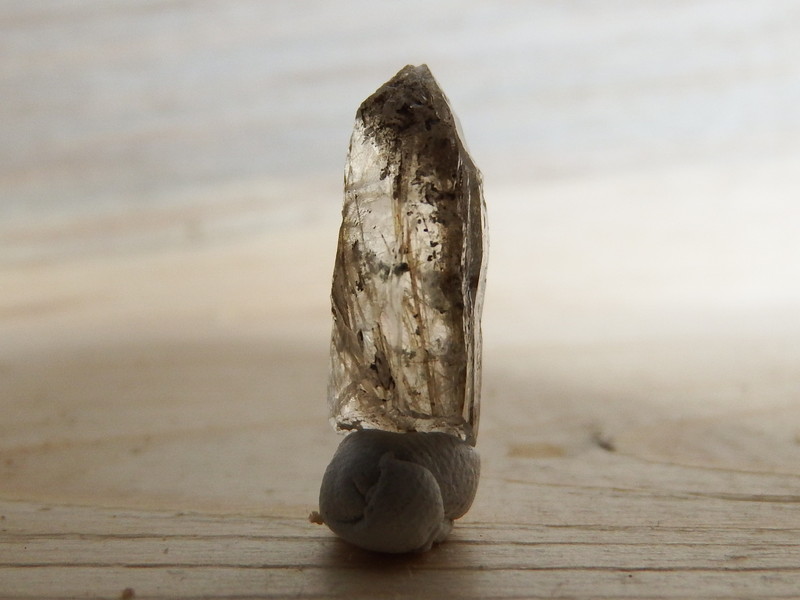 竹森産の水晶です。 ![]() 竹森は現在採取が禁止されていますが 幸いなことに 欠片はたくさん譲っていただきました。 ![]() ただ、よいものはもらえませんので そういうものは自分で揃えるしかありません。 ![]() ということで 小さなものですが竹森のポイントです。 本当に小さいです。 全長1.5cmほどです。 ![]() それでも立派に草入りになっています。 淡褐色の針状結晶の いわゆる「すすき」の正体は苦土電気石です。 実体顕微鏡48倍。 さらに100倍でも。 周りについている透明のサイコロは 氷長石でしょうか。 ですがもっと気になるのはマリモ状の内包物です。 実体顕微鏡48倍。 ピントが合っても曇っていて見えませんが 緑泥石と考えるのが無難でしょうね。 |